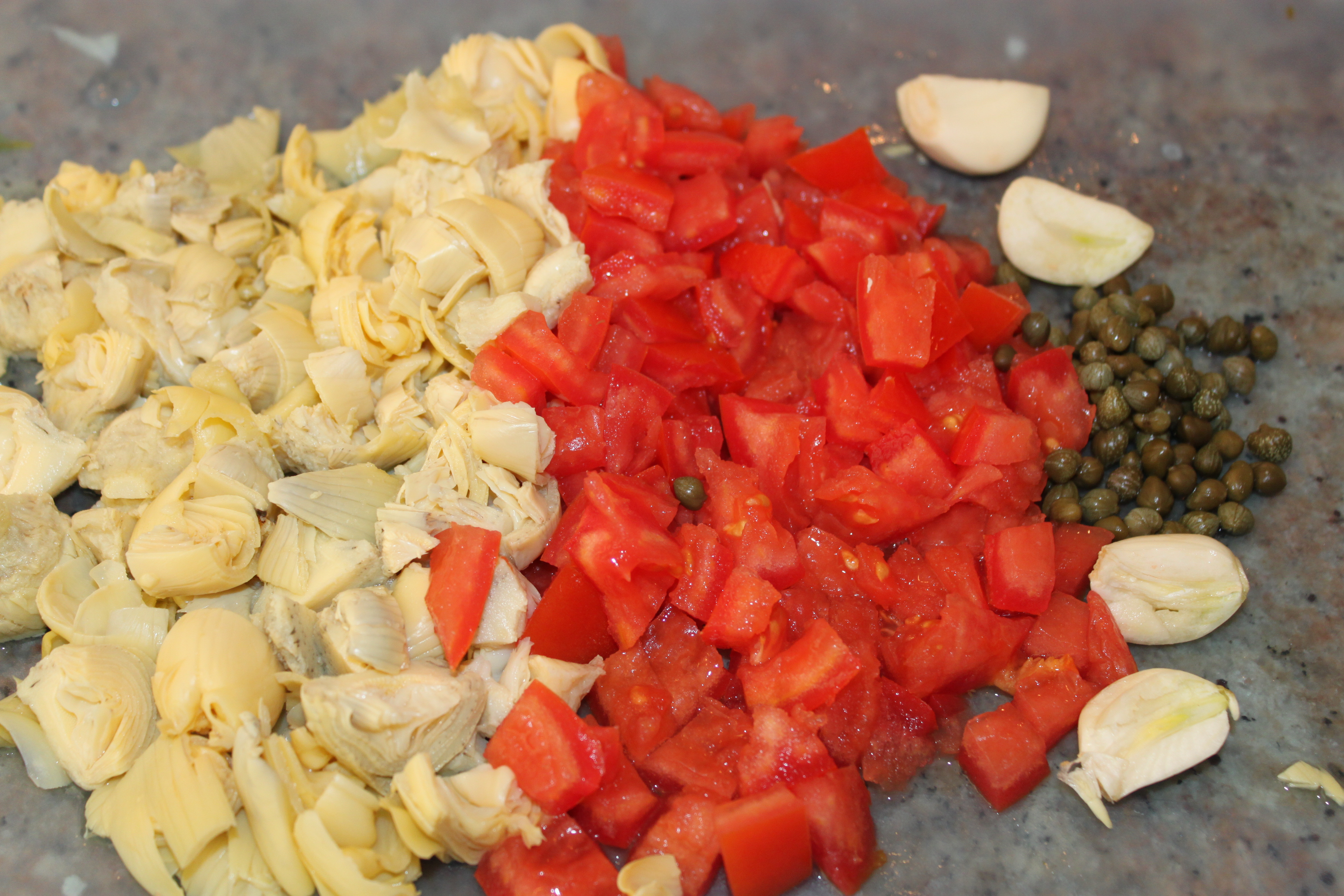 - Cut up the chicken and add salt/pepper. Cook chicken on Med/High in same pan used to cook veggies. Turn and continue cooking until no longer pink in center about 6-7 mins. Add a little chicken broth and scrape bottom.
