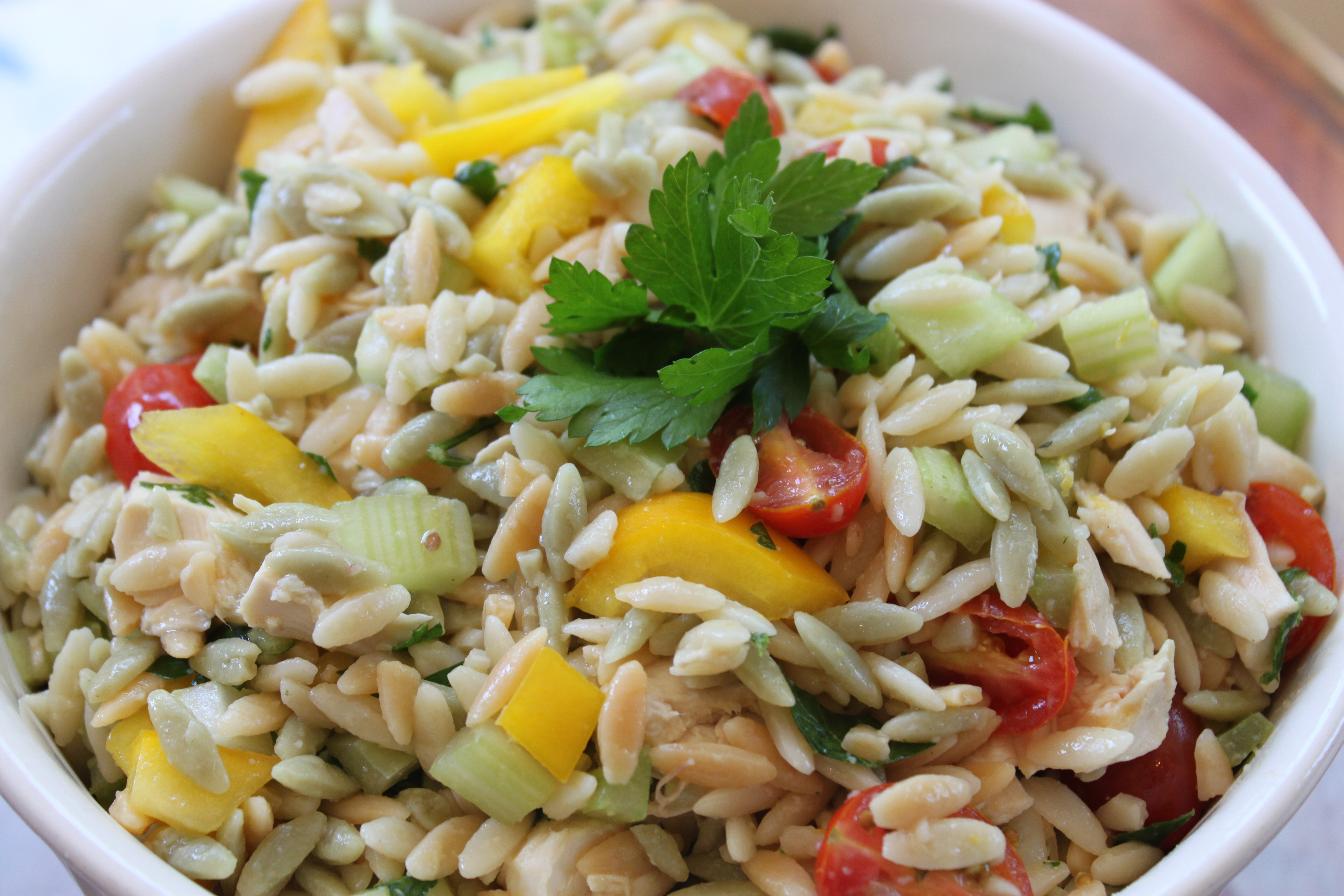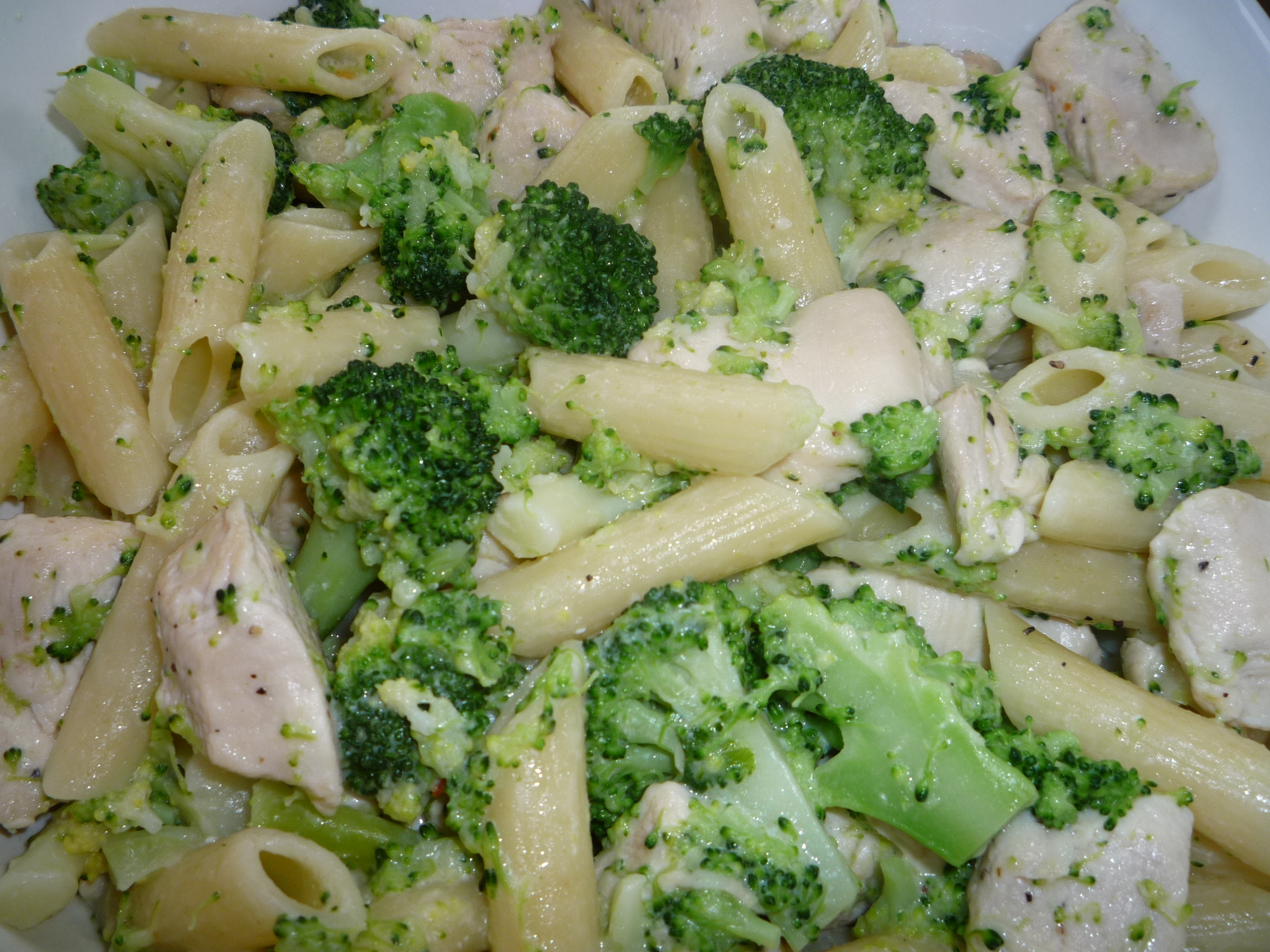 - Pour the pasta and veggies into the chicken and stir. Add a little pasta liquid or chicken broth to thicken. Top with some grated cheese.