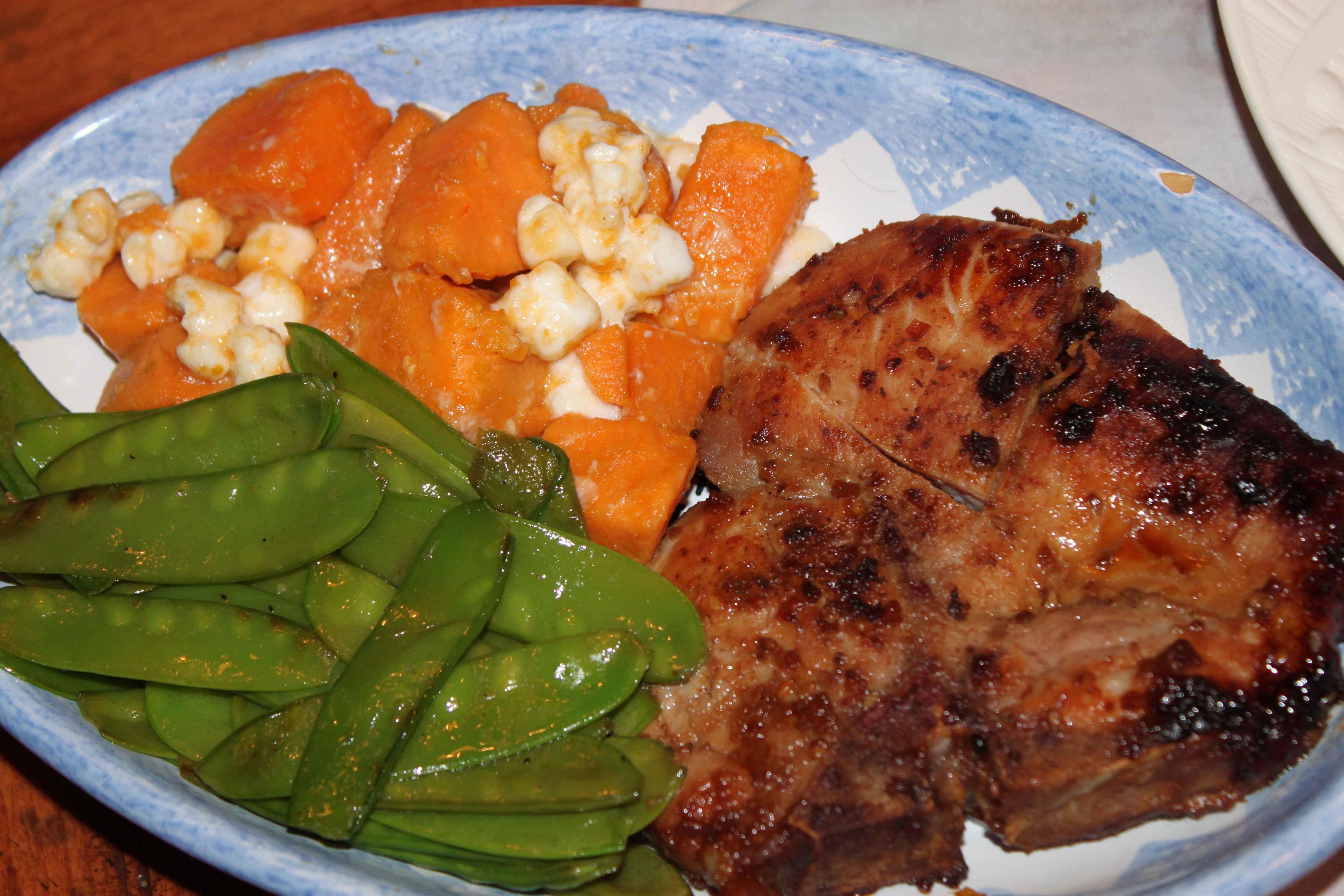 Marinate Pork: ½ cup olive oil, 4 cloves of garlic, ¼ cup of white wine, ¼ cup of chicken broth, 2 TBS of fresh chopped rosemary, 1 TBS of Thyme, Zest and Juice of 1 Lemon, Salt/Pepper. Marinate in Ziploc for 10 mins. or 10 hours.
